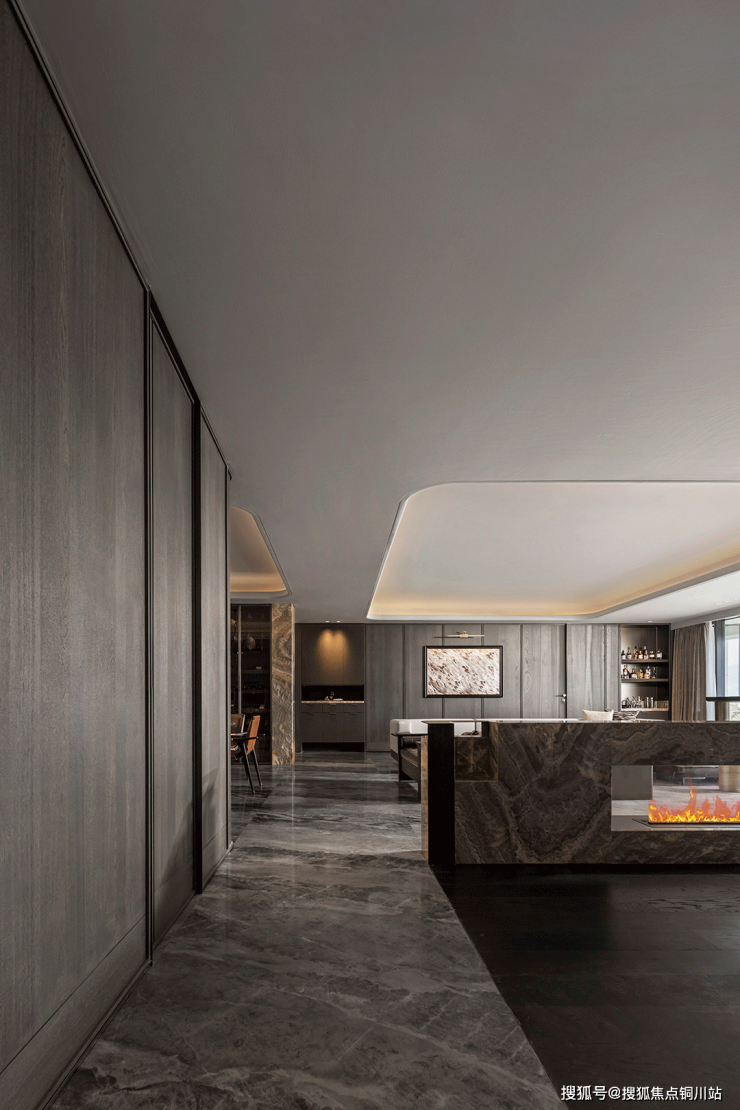 壁炉墙与玄关采用同款奢石,统一设计语言的同时,恰到好处的对空间进行了区隔,将奢美精致的定制格调充分演绎。