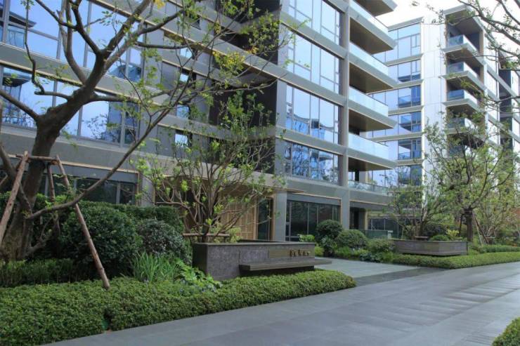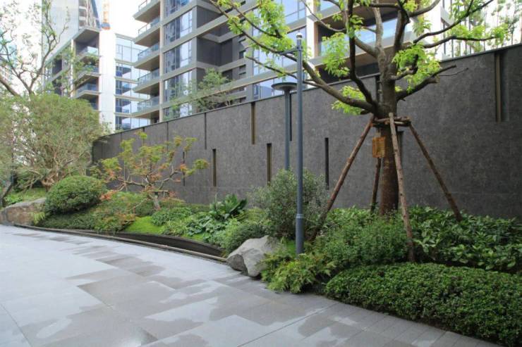 景观施工整体铺装轴线与门楼、汽车坡道精装共同放线确认,施工过程中统一按照确认轴线放线施工,防止施工过程中方向偏位,线接口出现偏差。入口映入眼帘的是一高一矮两棵造型飘逸进口黑松,松与水景相映成趣,穿行而入,围合空间内山石小景与精致的格栅背景墙完美融合,开启愉悦的归家之旅。