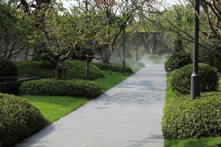 由动至静的流线型水景,住区入口为起点,一路顺流而下,形成一条贯穿整个林间的水景丝带,线条流畅自然,与周边场地道路、地形植被交错掩映。极简的镜面水景结合丰富绿植,潺潺跌水为溪流注入活力。池底为防止返碱采用胶泥薄贴,整体铺装完成后所有铺装缝为防止返碱积灰,采用黑色填缝剂进行填缝施工。