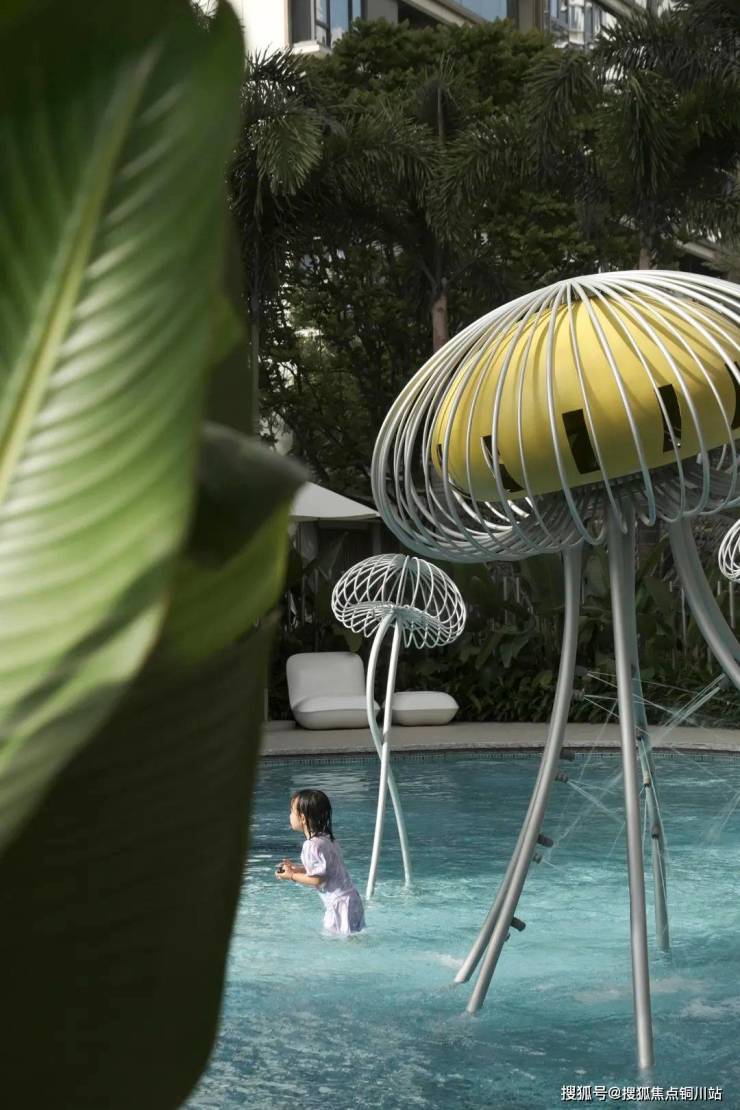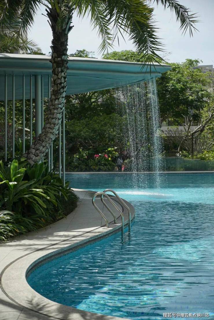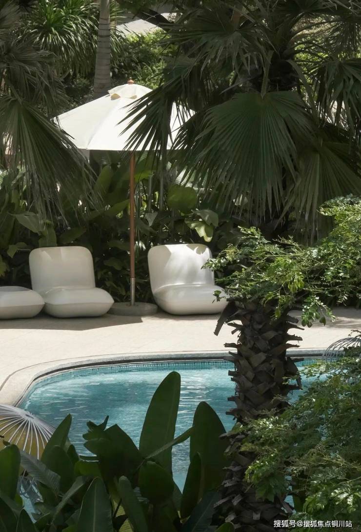 阳光穿透霸王棕层层椰叶,在森林泳池的水面上洒下斑驳光斑,树影倒映在水面,与池底纹样相映成趣,仿佛将整片蓝色天空揉碎在了水中。那流水音廊滴落的声调,仿佛是来自大海的呼唤,让人豁然开朗。而泳池边,那蜿蜒如自然海岸的曲线,好似正在引领我走向“大海深处”。
