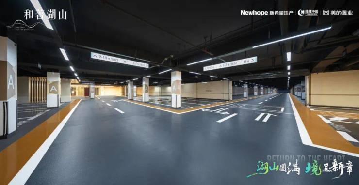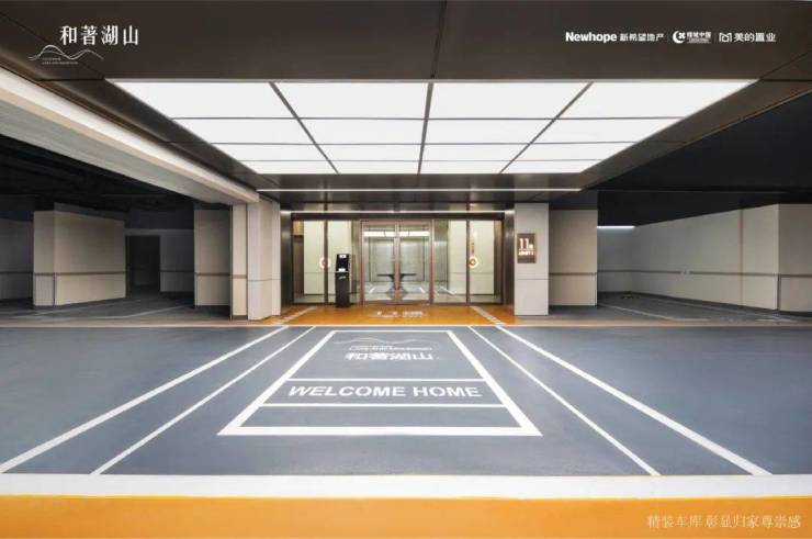 地下车库的打造更显用心。高奢精装地下车库入口两侧,约1.2x2.6米超大瓷砖通铺,车库内部顶部内嵌LED条形灯带;地面车道为橘皮环氧地坪,车位为光面环氧地坪,整体空间宽敞明亮。