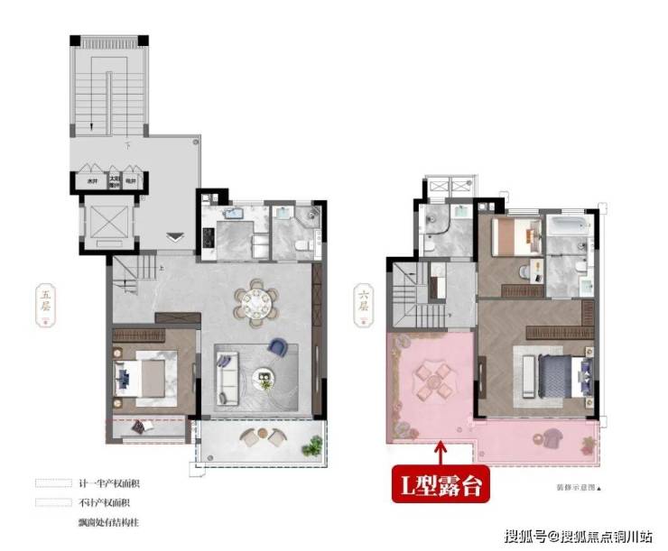 建面约144㎡的上叠,设计了一个可俯瞰四季四景的L型露台;