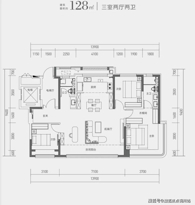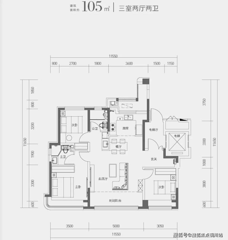 洋房户型共有三款:建筑面积约105㎡、128㎡、139㎡三室两厅两卫。