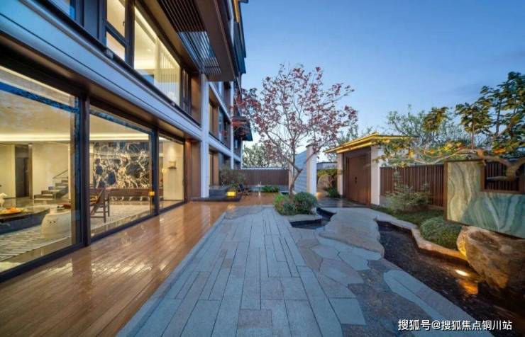 下沉式庭院的景观,则是另一番意趣:四水归堂的造型,不仅有一道飞瀑倾泻而下,而且中庭也是植入名木鸡爪槭和百年五针松,清雅、灵动!