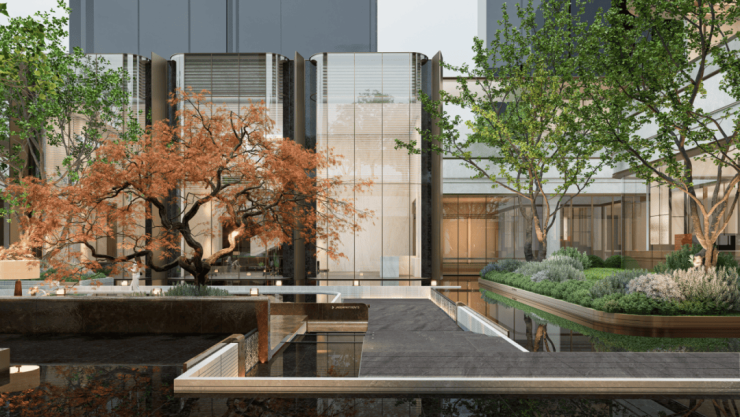 景观设计上,以“上城下林”为设计风格,讲究自然与建筑的互相渗透,一半繁华, 一半自然。