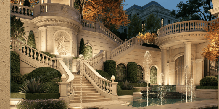 对称美学贯穿全园。从入口处融合模纹花园与阶梯水景的对称广场,到园区内几何形态的对称庭院,再到门窗、雕花、水景的细节处理,无不体现着对平衡与秩序的极致追求,赋予空间一种穿透时间的永恒质感。