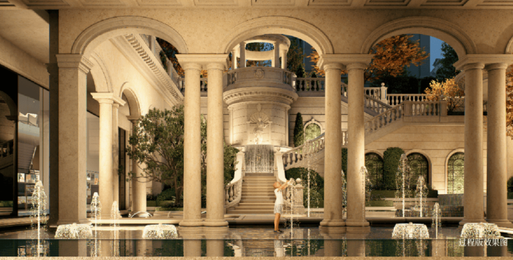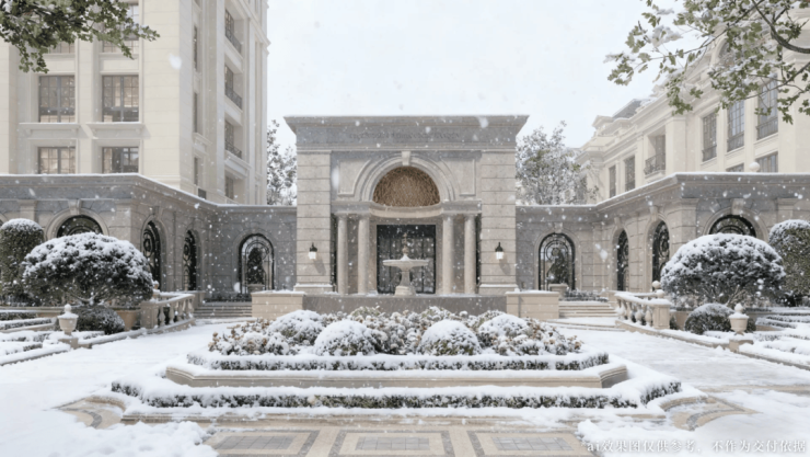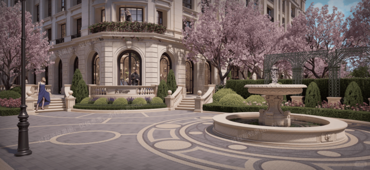 强烈的轴线精神是法式古典美学的灵魂。项目创造性地构建了“十字花轴”系统:由入口广场、归家大堂、中轴水院构成的“尊享仪式轴”,营造层层递进的归家礼序。