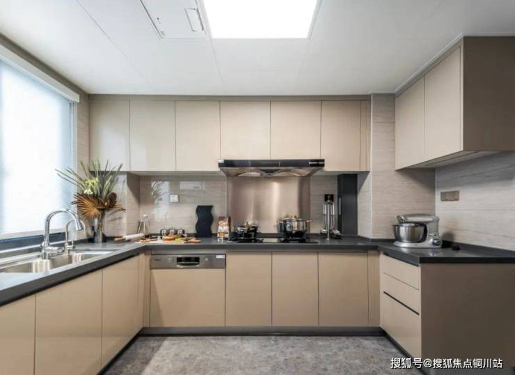 厨房配备了油烟机+燃气灶+嵌入式洗碗机,另有摩恩大单槽和抽拉式水龙头,此外还配置了滨特尔前置+末端净水器(或同等品牌)。