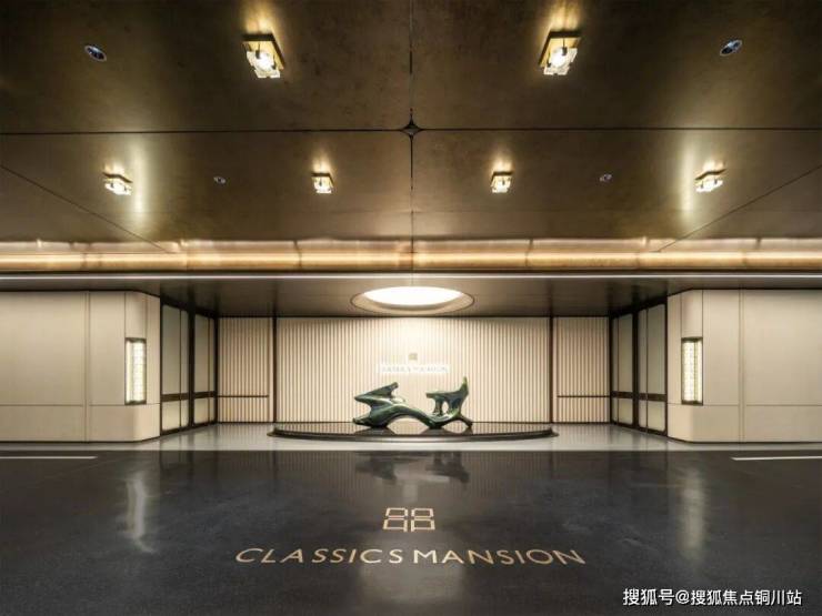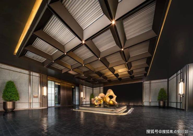 约6.3米高、面积超420㎡环岛落客式车马院空间,地面是福鼎黑石地铺,立面是浅色白世贸奢石,打磨成水波纹样。鎏金格纹重顶,有着故宫藻井的帝王气象。整面范思哲黑的流水景墙,灵动大气,与中心艺术雕塑相呼应。