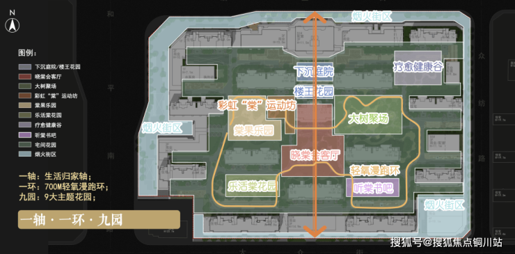 规划了一轴(生活归家轴)、一环(约700米轻氧慢跑环)、九园(9大主题花园)。