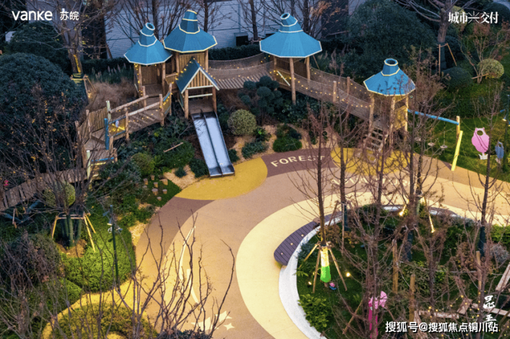 万科昆吾以一座“全龄丛林探秘乐园”,兑现关于家的美好想象。项目充分考虑不同年龄层儿童的兴趣特点,通过规划分龄分区设计、标志性魔法树屋、互动动力溪流、隐藏式大树课堂等,让孩子边学边玩;同时也未忘记陪伴的家长,在儿童乐园设计了家长看护区、洗手台、婴儿车停放区、无线充电平台的休闲桌,让看护与互动自然发生,使儿童区成为全龄共享、自然相伴的社区活力核心。