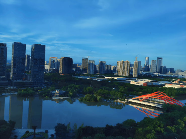 站在阳台望去,一侧是氧气公园的草木葱茏,晨练的老人、嬉戏的孩童构成生动的生活剪影;另一侧是甬新河的粼粼波光,偶有飞鸟掠过水面,搅碎满河金辉。