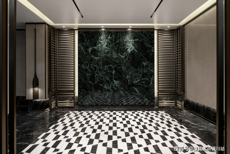一层入户大堂对标世界级奢华酒店,以艺术化的石材、岩板铺贴,彰显雅致品味。
