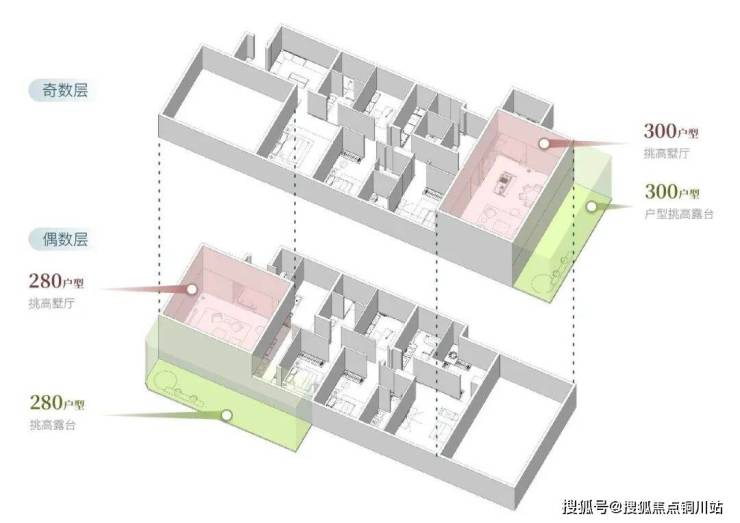 由此呈现出 “露台 + 客厅”、“露台 + 卧室”、“露台 + 墅厅” 等多元场景组合,满足不同业主的进阶式生活需求。奇偶错层的露台设计,直接让露台上部挑空增高一倍,开阔感与通透感全面升级。极尽尺度的面宽与进深,最大化扩张空中露台的面积,户均露台面积可达约 20 - 30㎡,相当于直接增加了普通户型一个客厅的面积。