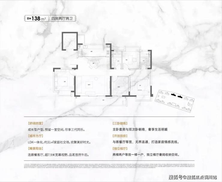 建面约138㎡,4室2厅2卫设计,更大的面积意味着更大的尺度和更大的舒适度,四开间朝南+南向双阳台,带来与众不同的采光体验和景观视野。