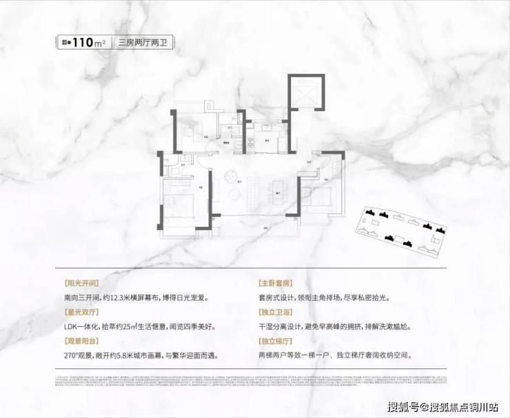 建面约110㎡,3室2厅2卫设计,布局合理,独立入户玄关,进门解放双手,进门看到宽阔的横厅,连通两面宽南向景观阳台,充分吸收阳光。U型厨房设计,动线流畅,主卧套间尺度设计。