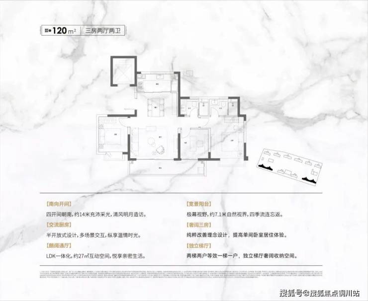 建面约120㎡,3室2厅2卫设计,享受社区头排无遮挡的南向极幕视野,约14米开间、城芯唯一三房全朝南、约7.1米宽境阳台,定义王牌尺度和奢享。