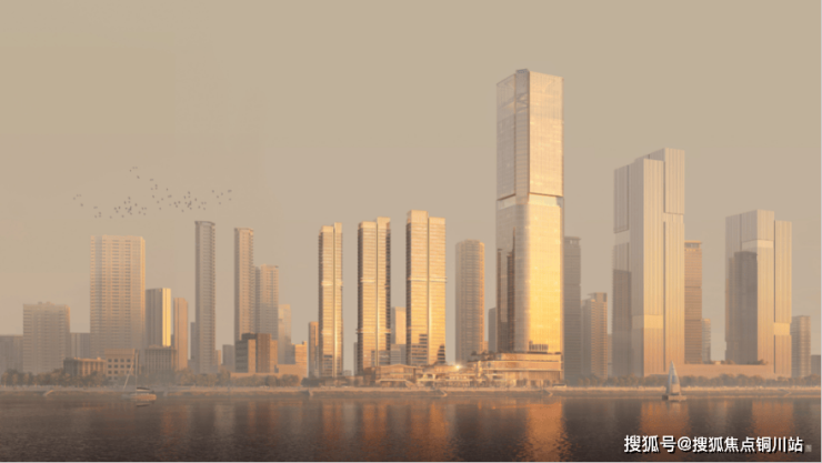 悬浮江上的超流体摩天地标,优雅香槟金横向飞翼线条,辉映长江落日余晖,以先锋性创著赋予建筑灵魂与生机。