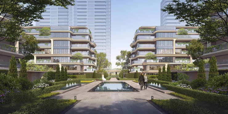 在园林景观方面,项目以“三院三轴九境”的结构,打造沉浸式景观,以潮水、岛屿、林落这些自然场景,形成漫赏院、友居院、悠享院三大院落。