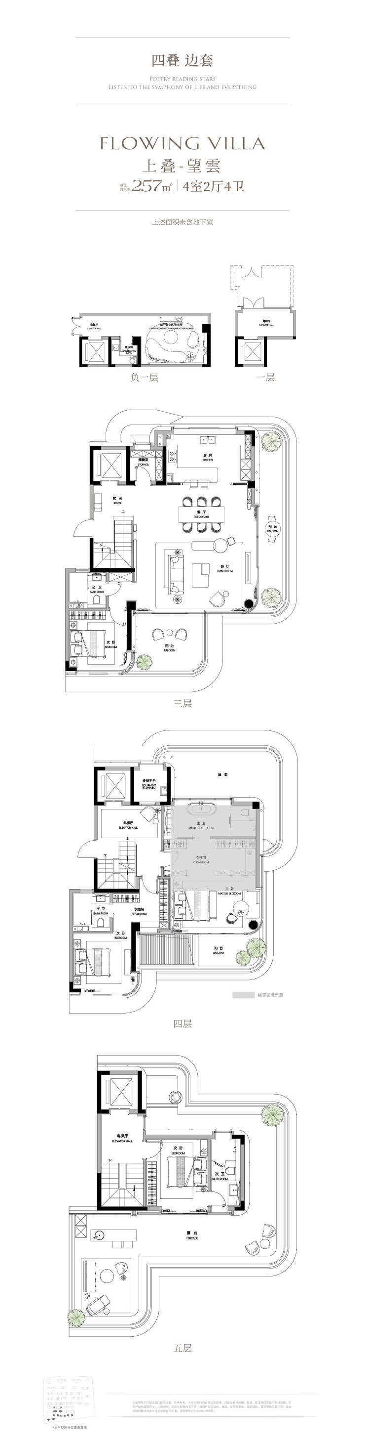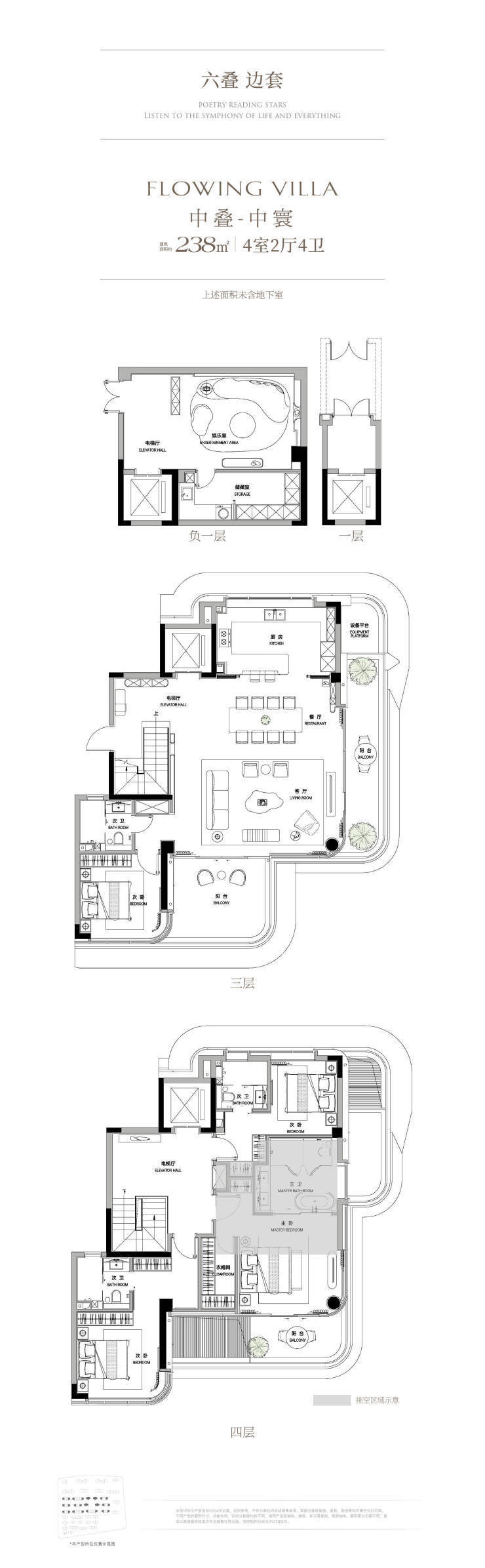叠墅L型的转角观景阳台,搭配全面屏落地玻璃窗,打造270°全景视野,享受全方位观景体验;每户均配置私家电梯,可独立入户。