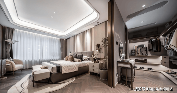 与外立面呼应的全房弧线吊顶,让空间也有了节奏感般的变化。主卧背景墙采用柔软的皮革与硬朗的金属元素,舒适而有质感,兼具生活温度。