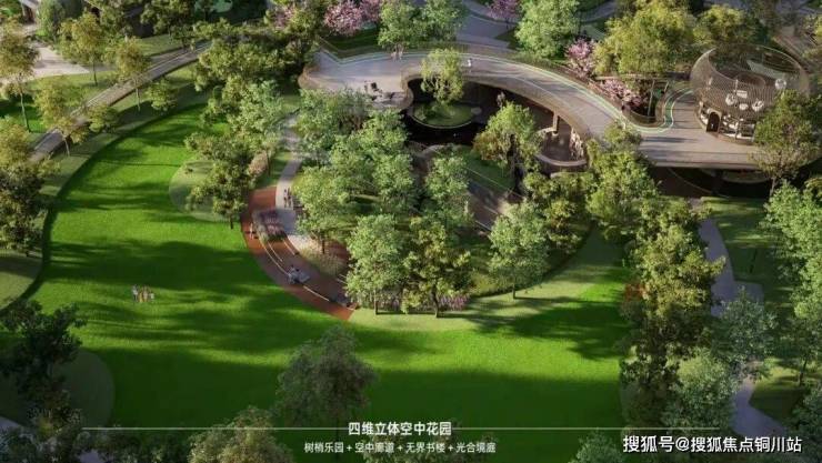 社区内部打造上,采用围合式布局,通过无界街区围合,超百米中庭,约1.4万方立体公园,营造全景全龄组团围合。