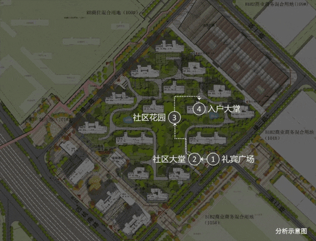 通过德建广场及商业文化轴的布置,将项目用地划分成南北两个区,北侧为静谧舒适的高品质宜居社区,南侧为充满活力的青年社区。