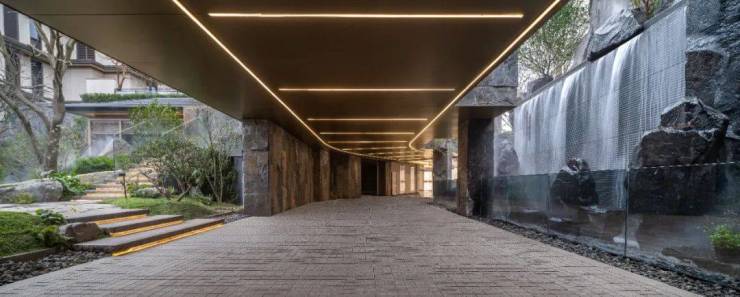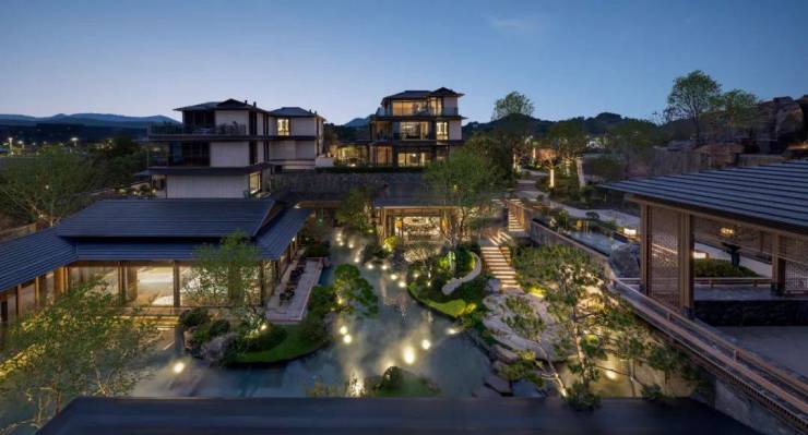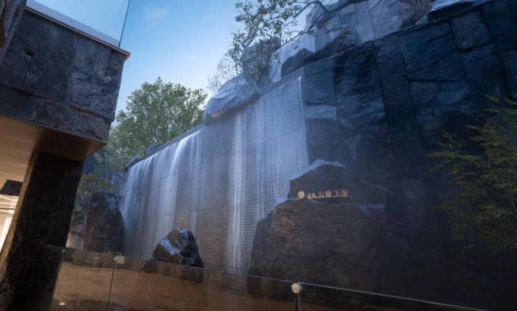 景观特色:项目背靠仁湖、依山而建,引千年仁湖水入中心水院,打造媲美雪窦山飞瀑的震撼视听效果;以宋代范宽名画《溪山行旅图》为底,打造 “寻溪七行” 之境。
