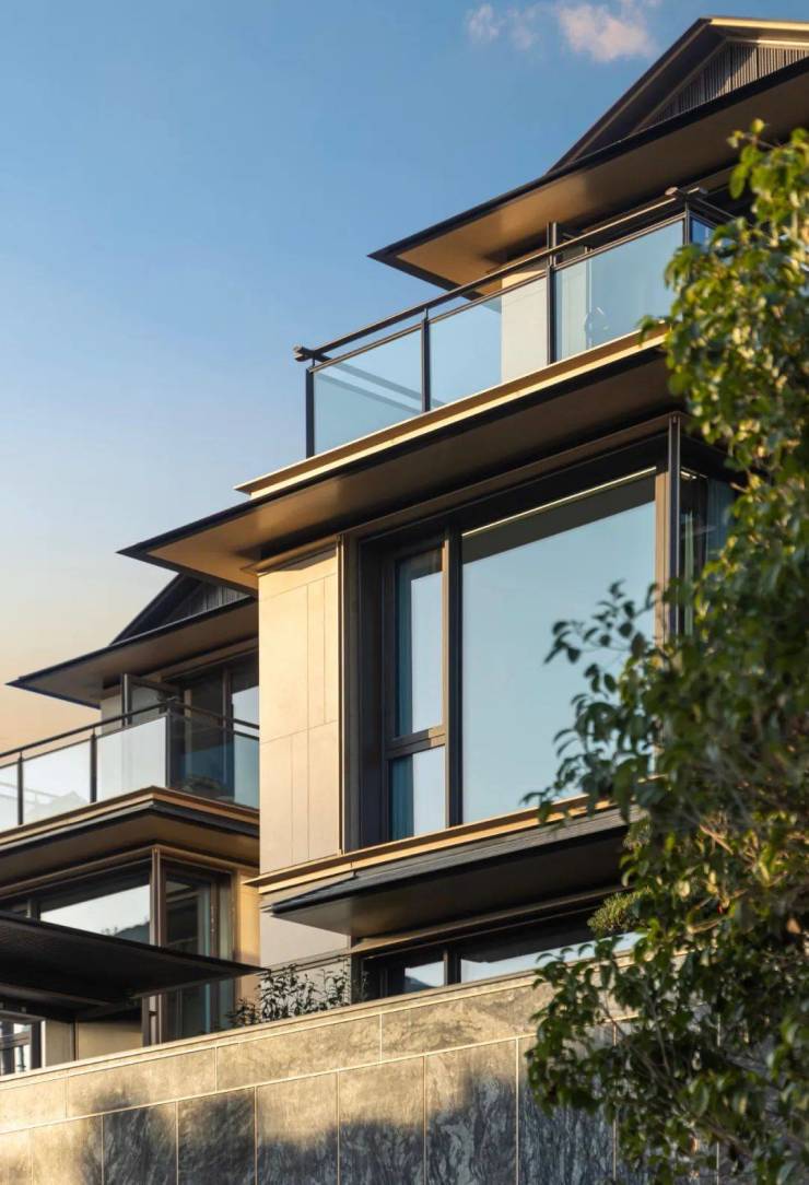 建筑设计:由 GOA 大象设计执笔,汲取宋代传统建筑的特征,采用铝板屋檐 + 大面积玻璃设计,配合超高窗墙比,打造轻盈通透的现代版桃花源居。