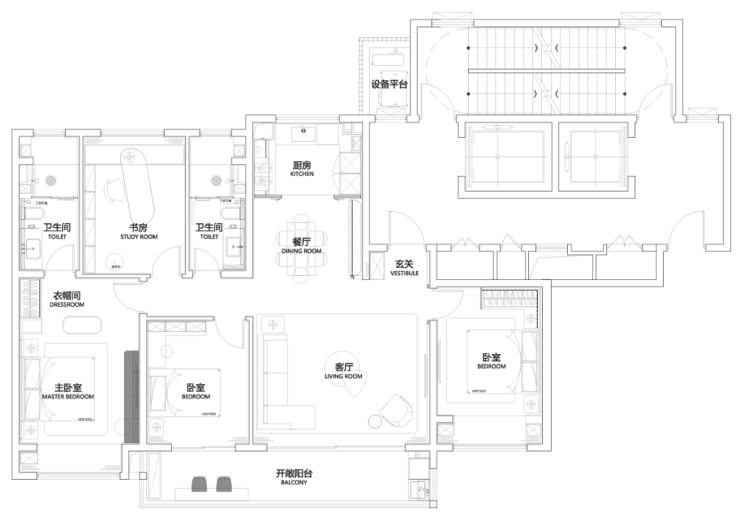 方正的LDKB一体化空间,半开放式中西双厨连接餐客厅,阔绰的家庭核心空间,妥妥的大宅空间体验。