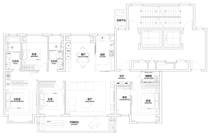 不可思议的是,朝南还设置单独的家政间,洗衣机、烘干机、洗护收纳都轻松安放。另一角度,也卸下了南阳台的家政功能,将风景与美学还给开放的公区。