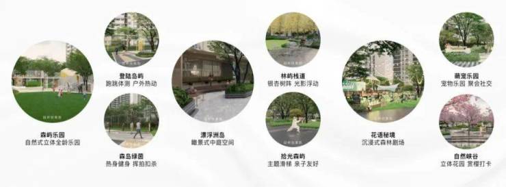 在对项目地块价值的深入解读之后,设计师发掘并重新定义项目地块和汤逊湖的关系——在浩瀚湖水中漂浮的绿洲岛屿。以此关系为依托,并结合地块内部的自然高差特点,提取了“静谧浮岛,惬意时光”的设计主题。在社区内采用“一环三境九岛”的设计手法,营造一个城市“岛居”的生活家园,将度假氛围感拉满。