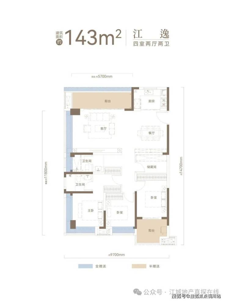 建面约143㎡户型,270°采光U型观江+高比例阳台赠送+“3+1”格局动静分区+约30㎡主卧套房。