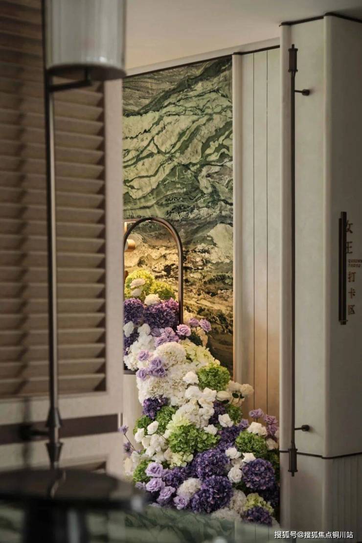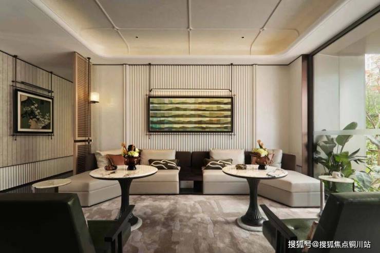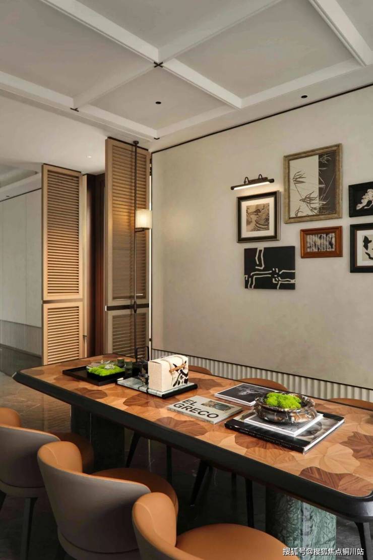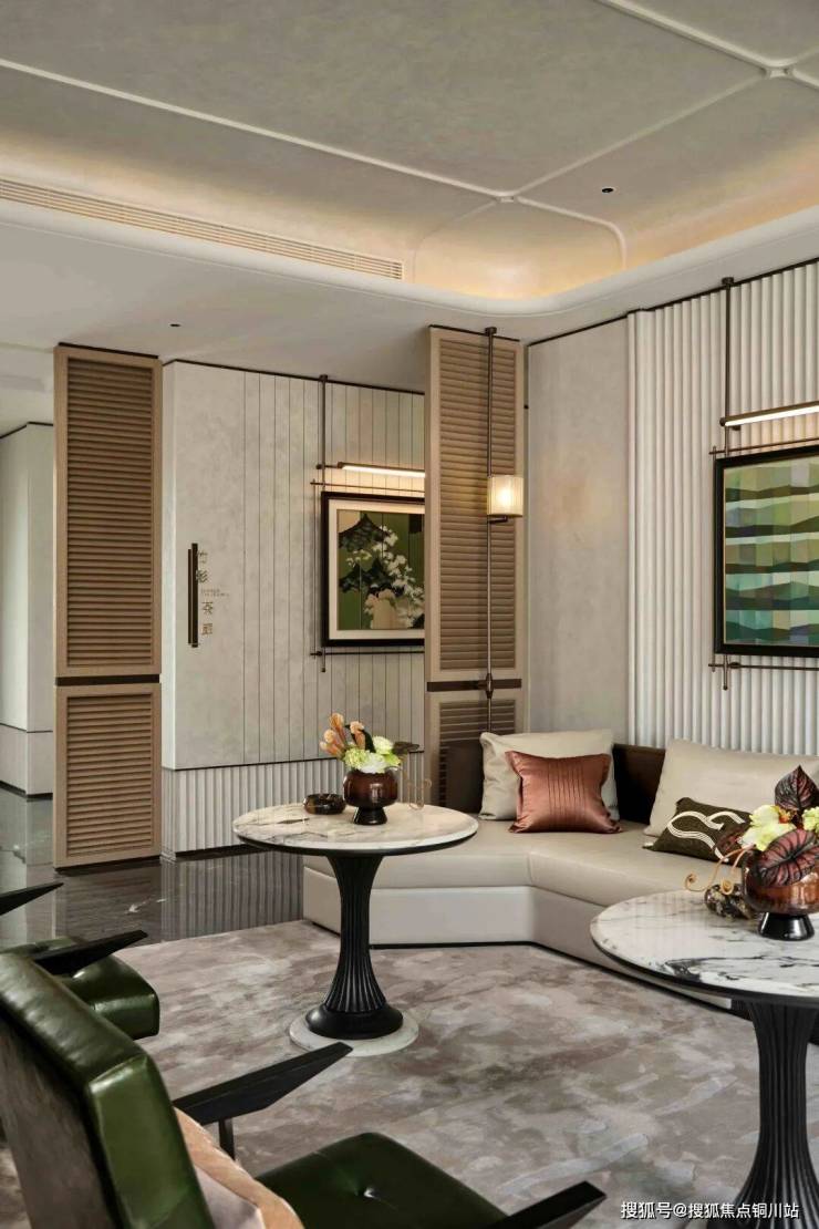 “竹影茶廊” 取意苏州园林的漏景之妙,以竹为屏、以光为笔,勾勒出“月映竹成千个字”的静谧画境。翠竹摇曳,茶香袅袅,为人们提供了一个静谧悠然的品茗畅谈之所。暖棕色拼花台面搭配皮制座椅,彰显贵气与奢华。