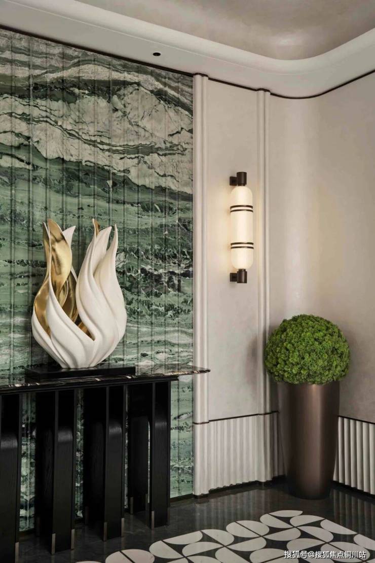 深色石材地面如砚台墨韵,浅米色艺术涂料墙面似宣纸铺陈,搭配翡翠玉石拼画点缀,仿佛将园林的苍翠引入室内。茶座区家具以胡桃木与皮革材质相融,形态低矮舒展。米灰色软毯划定私密范围,邀人席地而坐,品茗闲叙,静听风过竹梢的虚响。