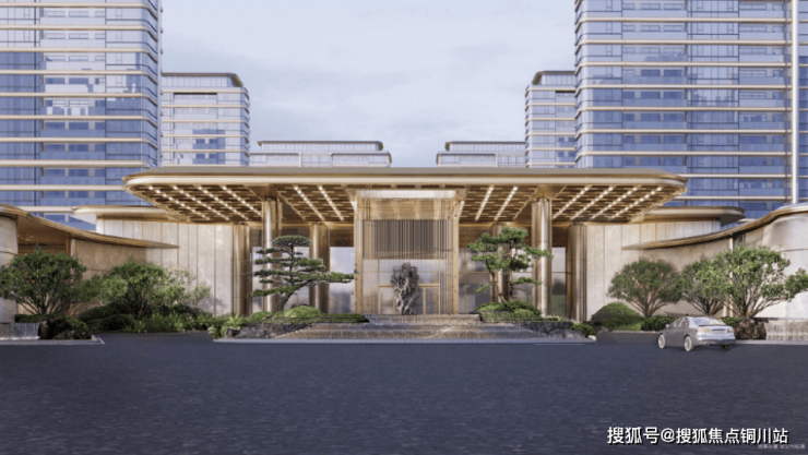 一体板、铝板高阶材质,气派卓然。建筑米白色为基调、局部深灰点缀,香槟金铝条点缀玻璃光感界面,曲直有度,去繁为简。
