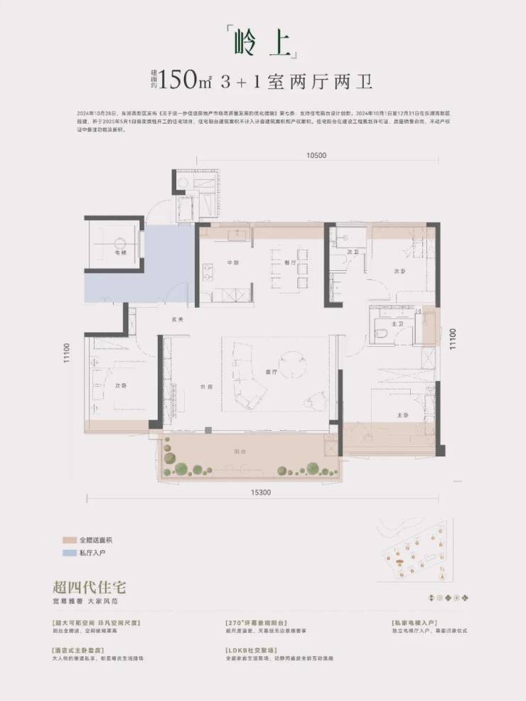 比如,建面约150㎡的户型实得面积可达约160㎡,堪比传统三代住宅一套建面约200㎡以上的户型,或者其他四代项目建面约177㎡以上的产品;