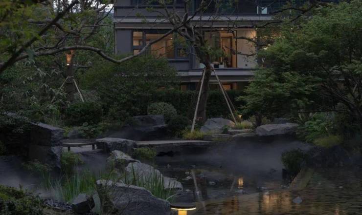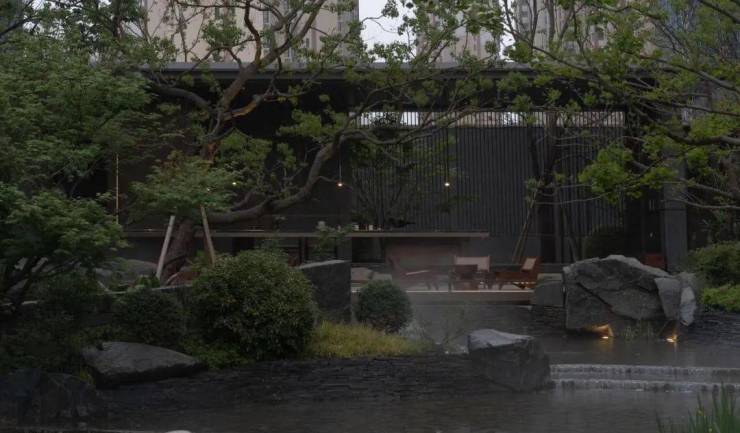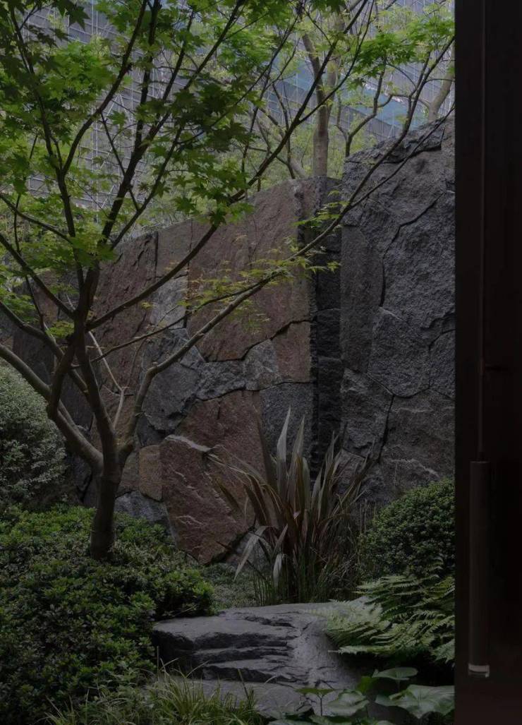 在中心庭院的设计上,我们通过大量的天然景石运用,还原大自然肌理。在池底的设计上,运用天然板岩叠拼的做法,搭配自然生境的植物组合,呈现植物与亭廊相互掩映的画面,让步行此处瞬间宛如置身山水画卷中,让居者从喧嚣的城市环境中,迅速平静下来,得到情绪的舒缓。