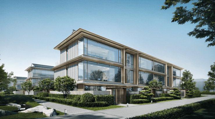 萃取唐伯虎《仿古山水册》三段式经典构图,融合苏式屏风山墙的型物之美,打造联排别墅的建筑形体。