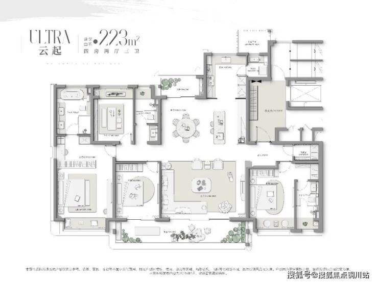 值得一提的是,狮山云起223㎡户型是区域目前同等面积中,唯一带南北双阳台的户型。多面采光的设计,模糊了室内外的界限,让南向约7000㎡中央景观的秀美、北向近1000㎡下沉庭院景观的旖旎,成为流淌进生活里的清风与阳光。