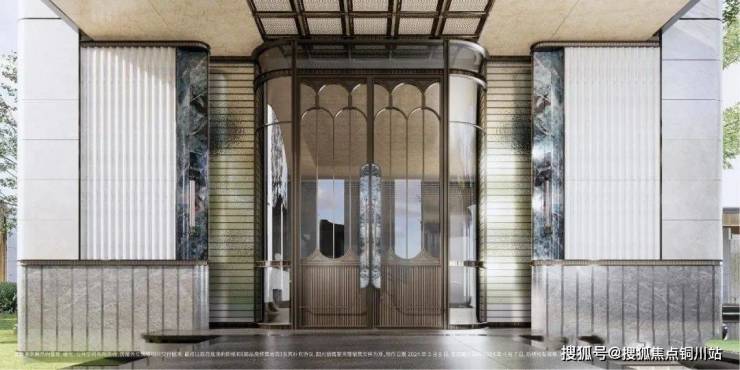 在楼栋主入口同样运用石材+弧形铝板等元素,同时还有格栅装饰,质感提升明显: