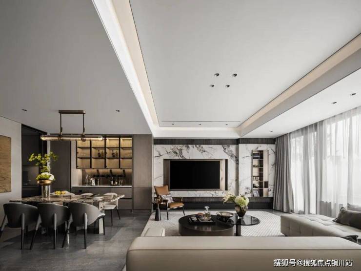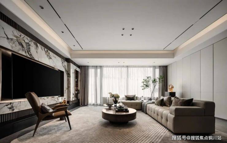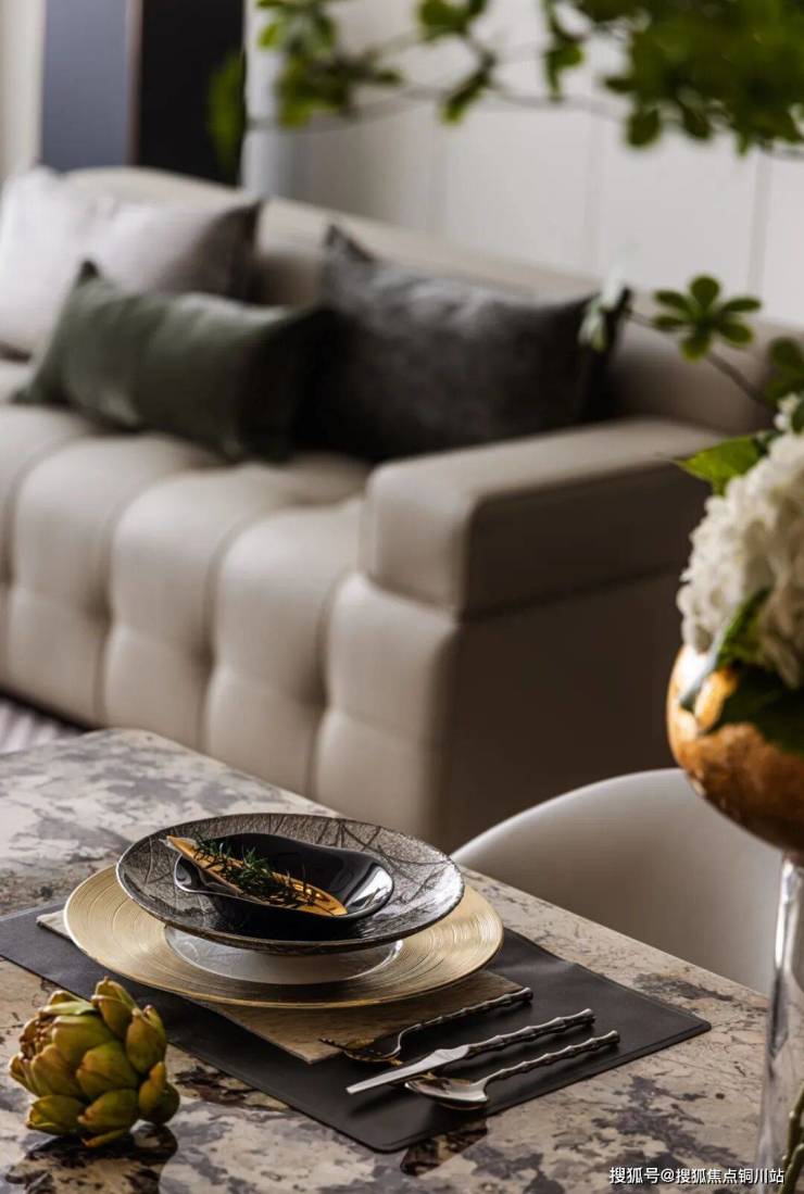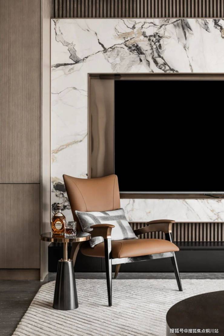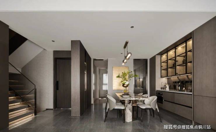 客厅的石材纹理的岩板背景墙成为空间的视觉中心,玄关处的木色柜子局部打造一个镂空,旁边的楼梯自然而然的与视线交汇,墙面轻盈沉稳的气质被打破,通透与轻盈的切换,为家建立起有规律的秩序。