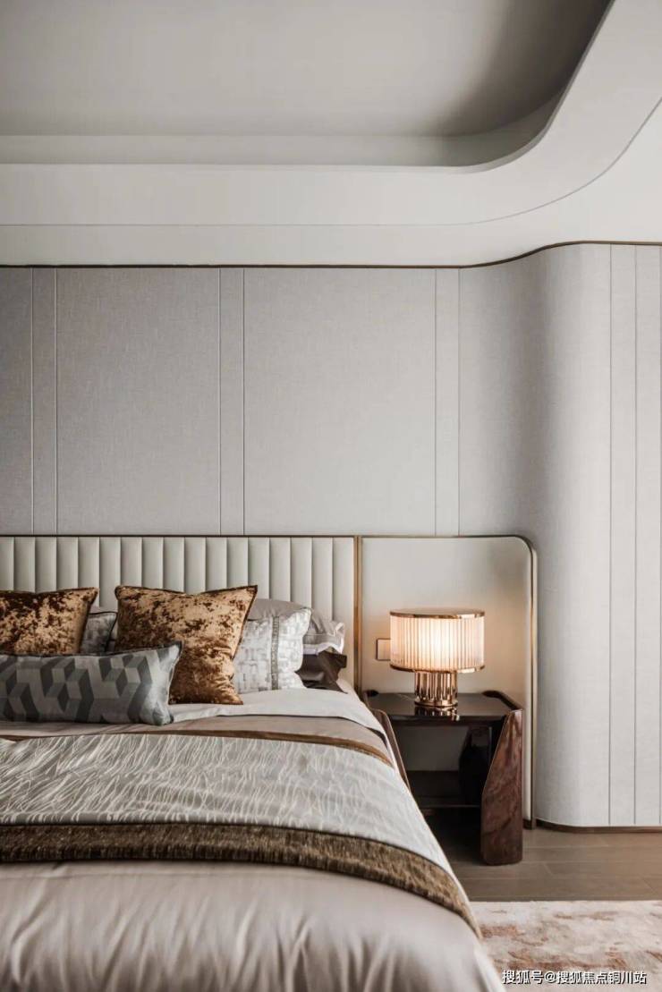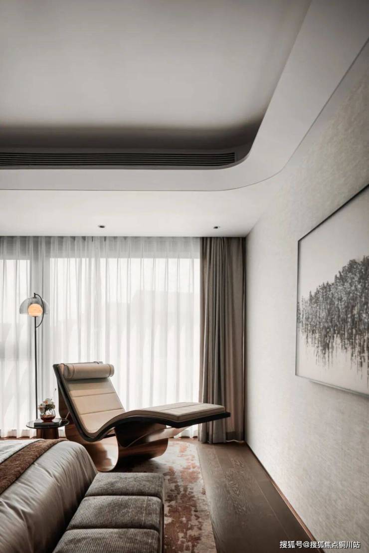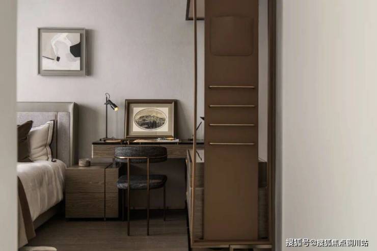 主卧奉行“以人为本”的原则,功能性是无可替代的首要准则。深色地板打造出层次感,同时套房式主卧,在奢阔的空间之中,搭配步入式衣帽间与独卫,自成主人精致品味,主卧大面积的落地窗,将窗外自然美景框进室内,清雅绿意在空间内肆意流淌。