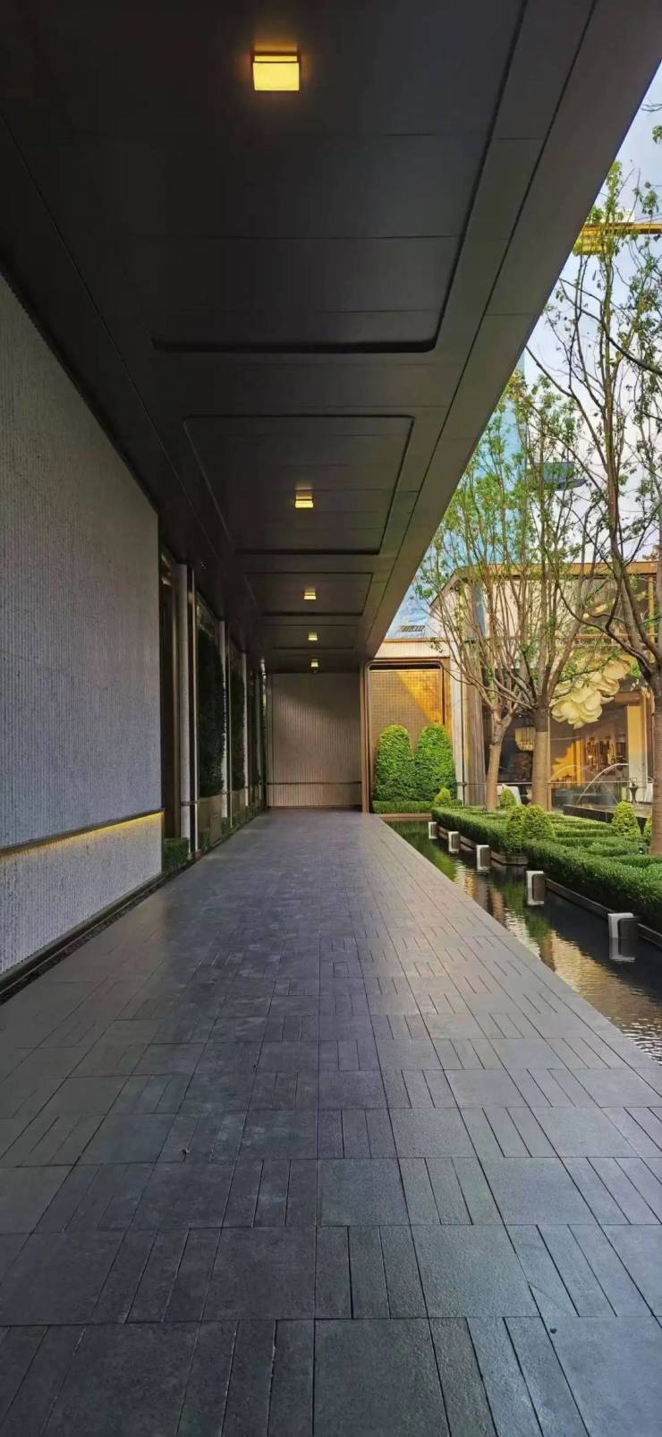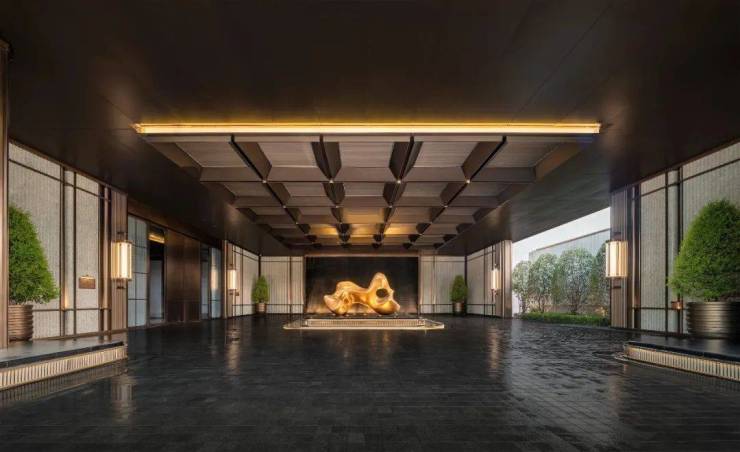 地下石材拼花,大面的石材景墙、铝板、树木阵列,极具仪式感。