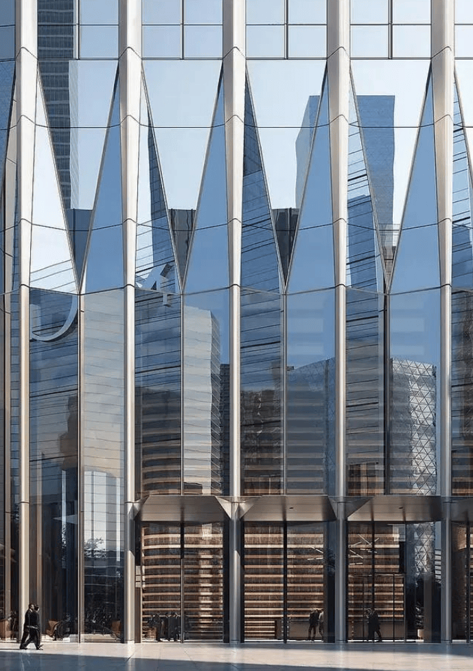 “长江之琴”的灵感深植于中国传统文化,由国际顶尖事务所KPF设计。其标志性的“遮阳鳍”结构自下而上优雅收束,宛若古琴琴弦,不仅赋予建筑独特的韵律美感,更形成高效的外骨骼支撑体系,使内部空间得以解放为开阔的无柱布局。