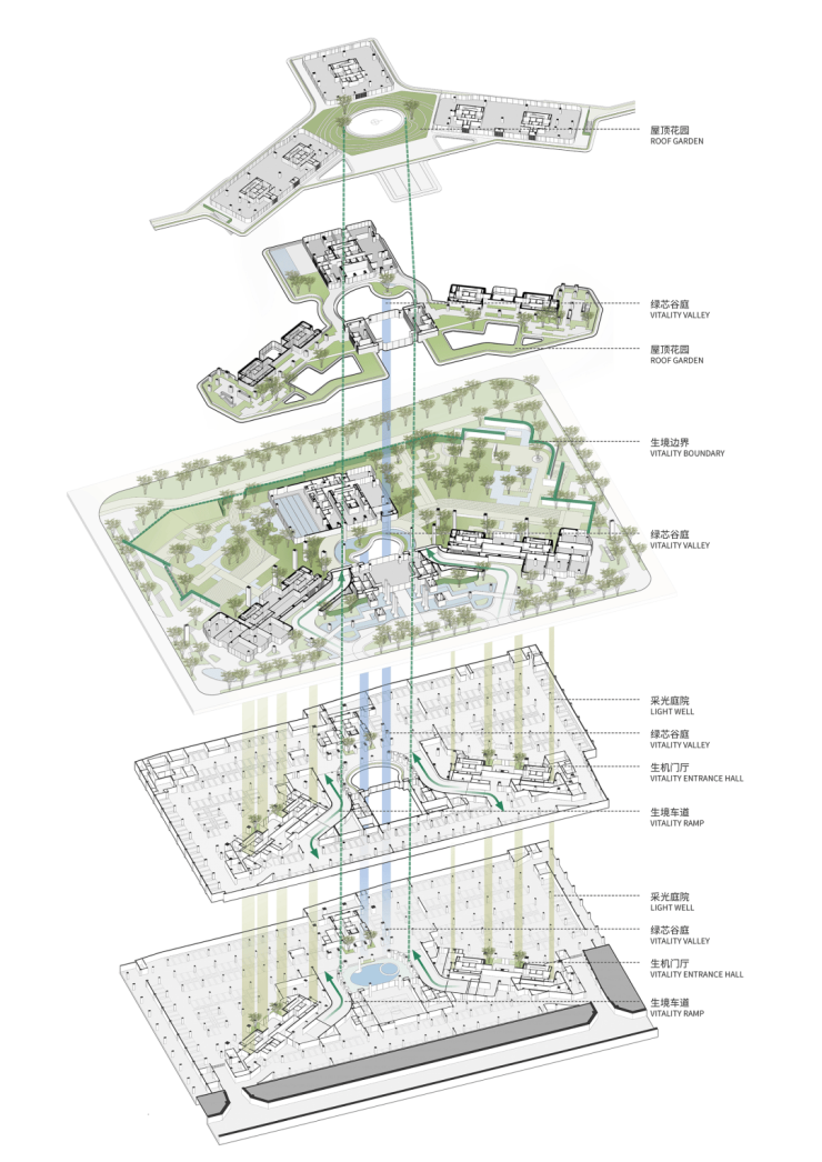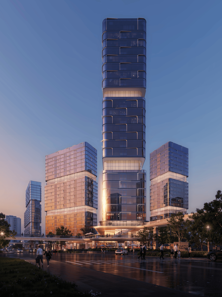 既定的“双Y形+L形”布局在城市网络中呈现异化的空间结构。设计运用立体分区与“生境底盘”理念,优化尺度与空间引导,消解异构布局的疏离感,并以差异化建筑形象与高效可达性强化坐标性。