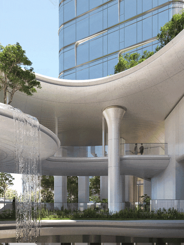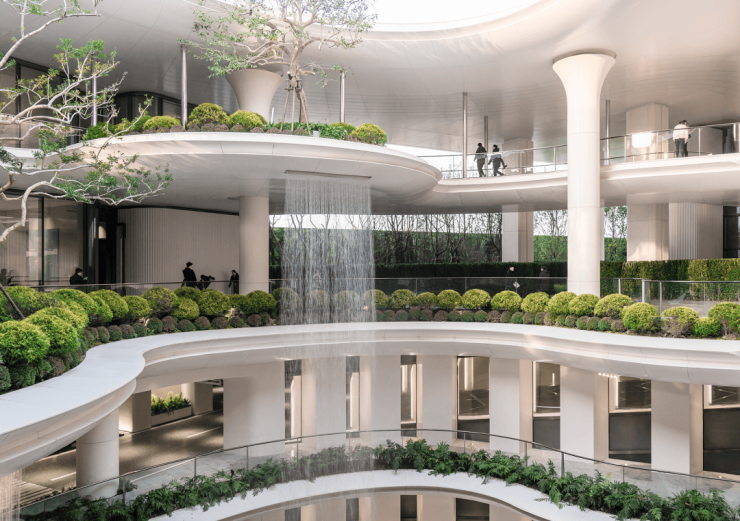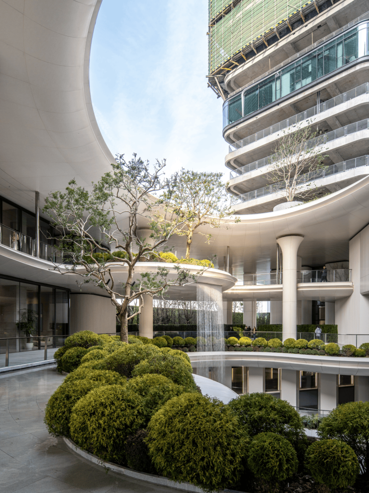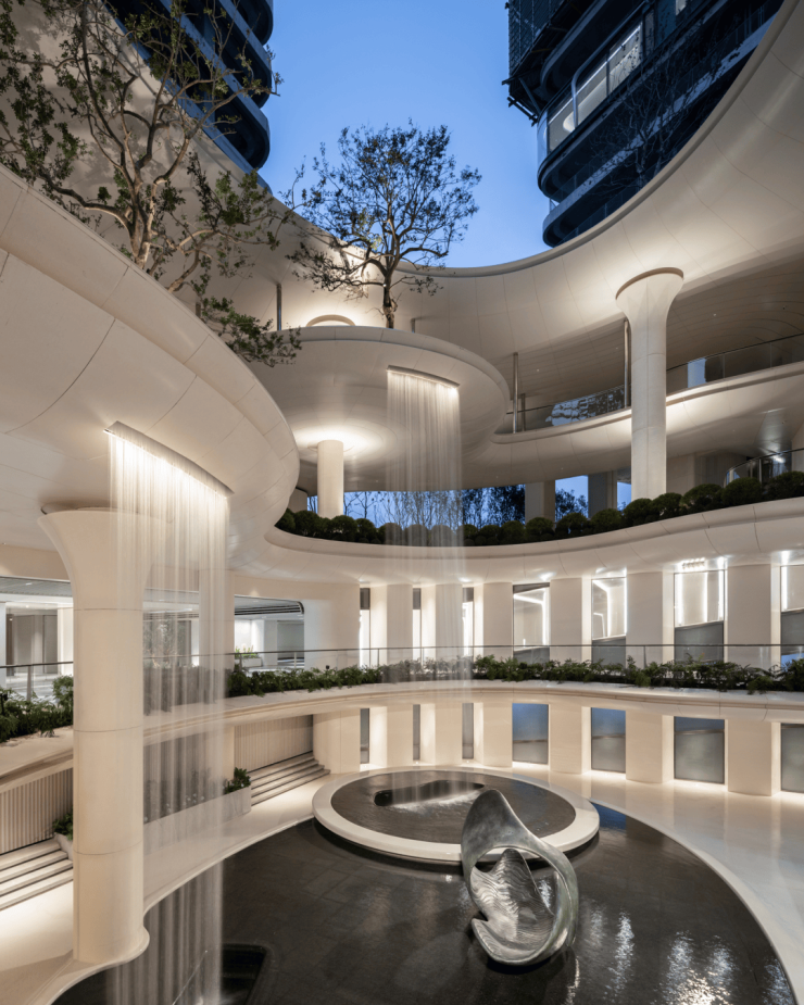 中庭以多层瀑布景观与垂直绿植为核心,结合艺术展陈、休闲活动与景观打卡,打造包容性公共空间。