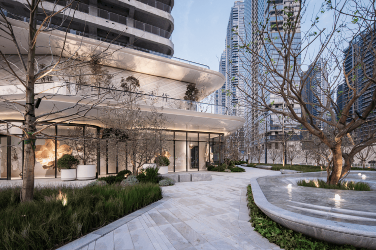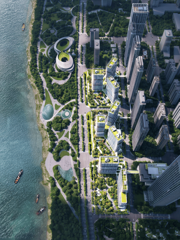 “生境底盘”作为枢纽空间,承担多层级、多流线的交互功能。立体路径连接8座塔楼与周边社区、滨江绿带,艺术中心、近人尺度的商业盒子、水平错动的天街和绿化平台共同营造亲和城市空间。