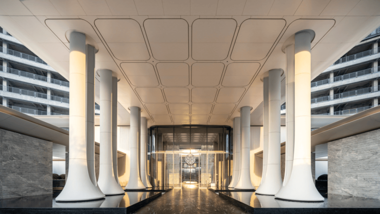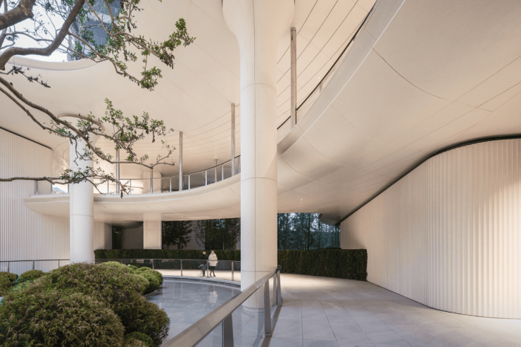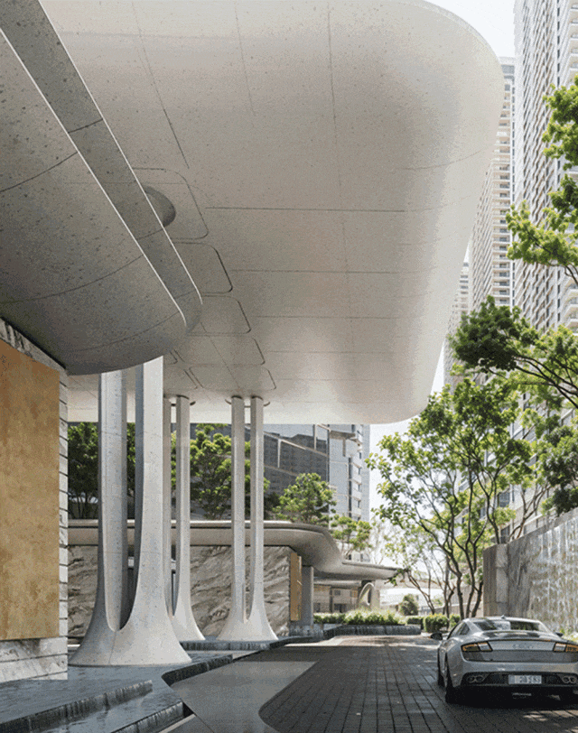 以C2地块为例。地下二层的地库与片区整体地下环路相连,部分停车位向城市开放。市民可经由公共车库、地下多功能厅的路径,或是通过沿街主入口,抵达各共享空间。艺术中心主入口设在沿街面,由8根白色UHPC树形立柱阵列支撑,形成10.5米挑高的视觉引导与标志性空间。