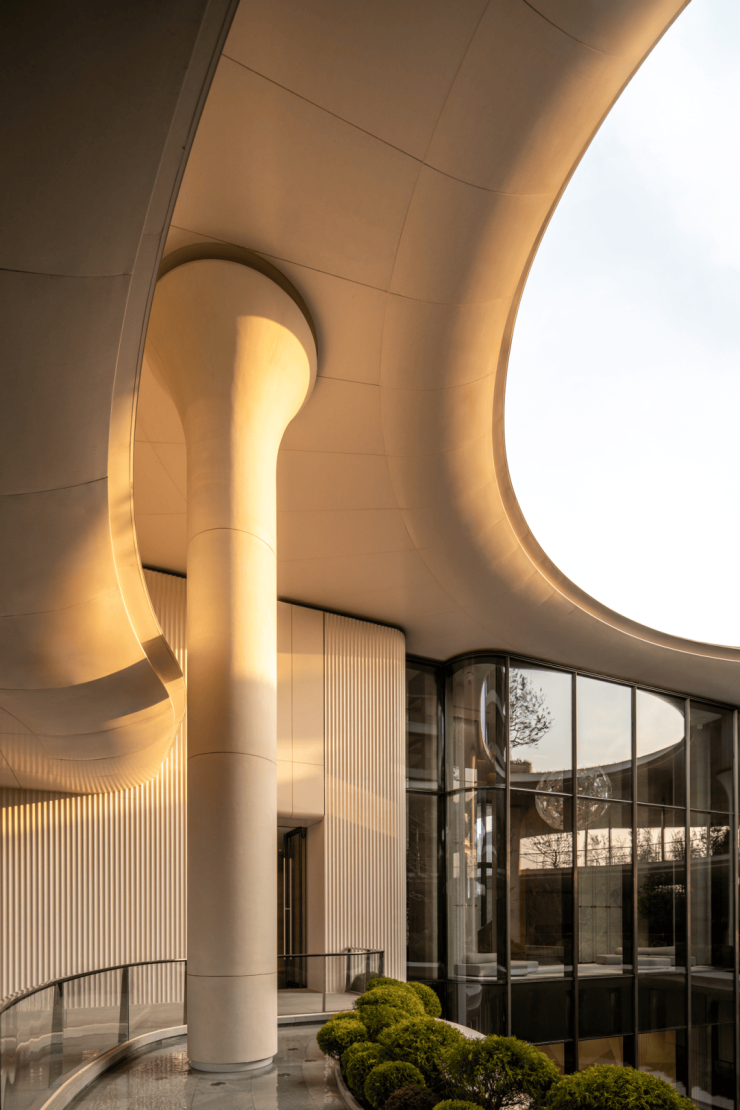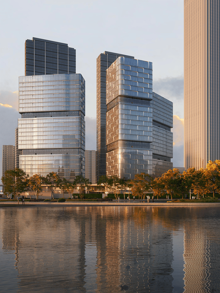 建筑整体延续群像式“长江画屏”概念,立面语言提取长江水纹象征武汉江城记忆,通过玻璃幕墙的金属构件呈现,与辽阔江面交相辉映,也与宋代马远《水图十二卷》中“长江万顷”意象相呼应。